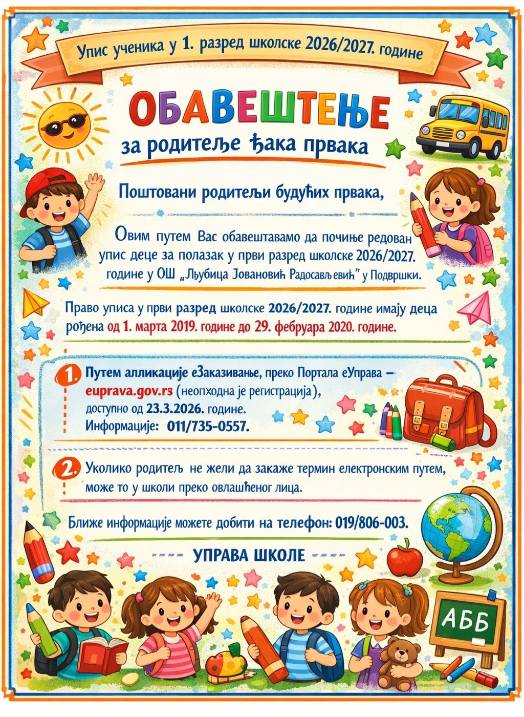 ОБАВЕШТЕЊЕ - УПИС У ПРВИ РАЗРЕДДатум: 16. Mart 2026 10:39 Категорија: 2025/26. Поштовани родитељи и старатељи будућих ђака првака, Овим путем Вас обавештавамо да је отпочео редован упис деце за полазак у први разред школске 2026/2027. године у Основној школи ,,Љубица Јовановић Радосављевић" у Подвршки. |